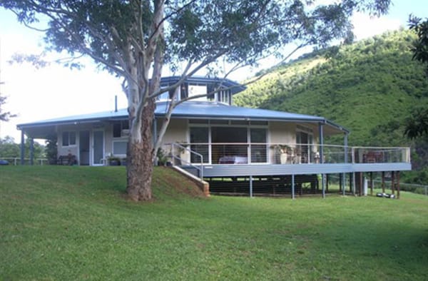 The house is a 24 metre diameter octagon with a three metre, 360 degree verandah. The exterior walls are mostly glass and steel with a corrugated iron roof. The entire house, weight approximately 50 tonnes, rotates up to 360 degrees and this function can be activated when rotation is desired.