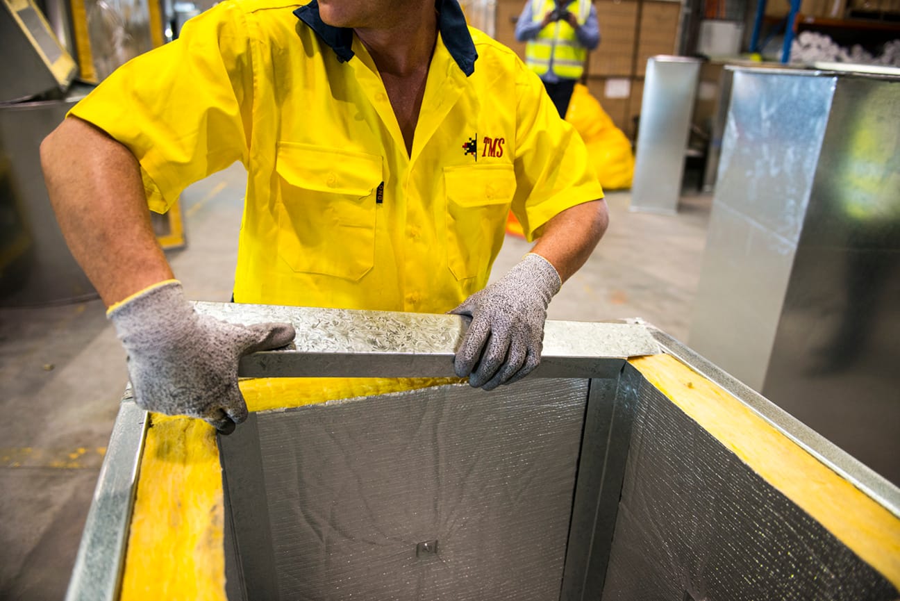 Commercial HVAC ducts are manufactured and insulated offsite by specialised sheet metal fabricators. During the duct manufacturing process, metal pins are welded to each internal face so that the insulation can be impaled and positioned as a continuous internal lining. Metal clips secure the insulation in place and metal angles or foil HVAC tape are installed to complete corners and edges.